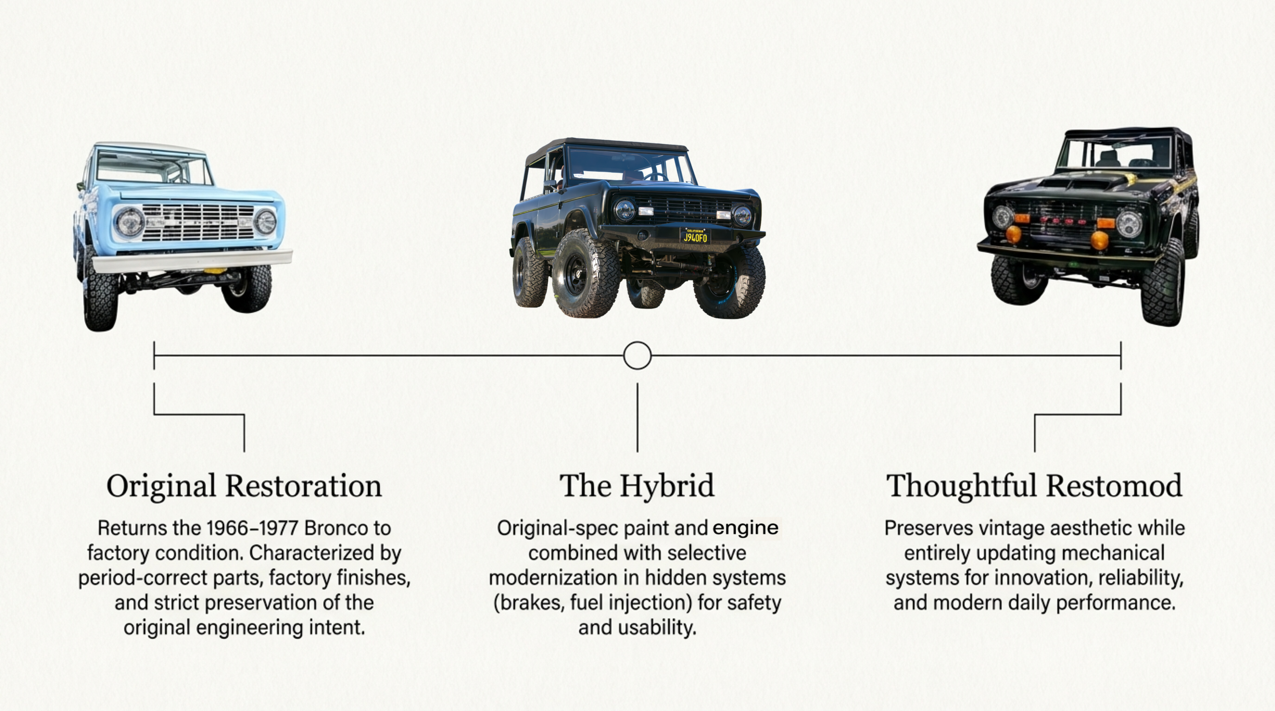 Neither approach is inherently superior. A concours-quality restoration represents craftsmanship and historical preservation. A thoughtfully executed restomod represents innovation and adaptation. Both, when done to high standards, produce vehicles that command respect in the Early Bronco community. The question isn’t which is better—it’s which is right for your goals, your investment scope, and how you intend to use the vehicle.