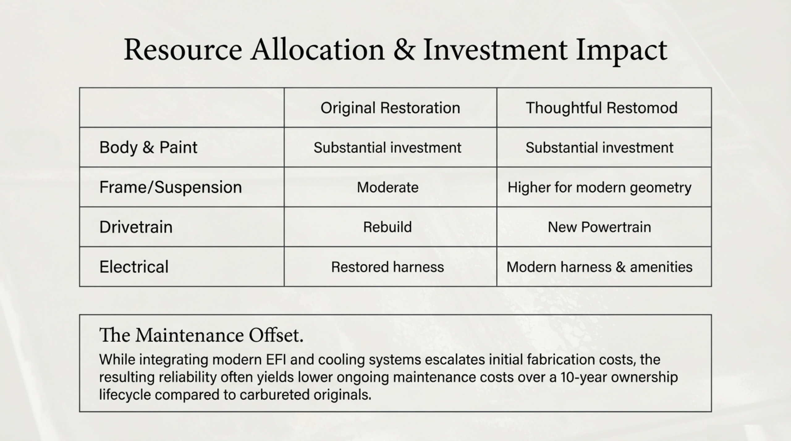 | Cost Category | Original Restoration | Thoughtful Restomod |