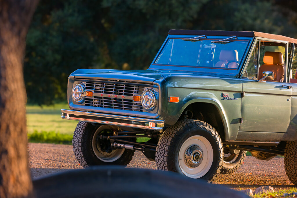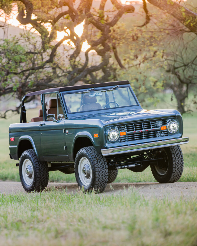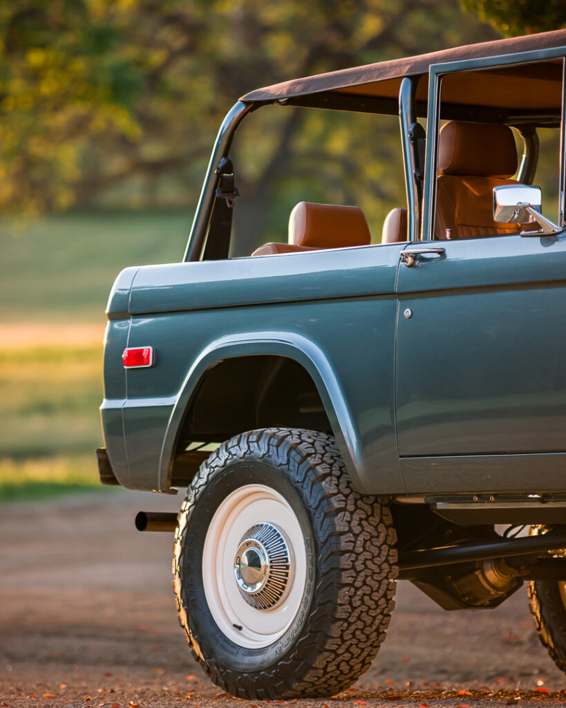 The exterior of the “Blue Ridge Mountain” Bronco presents a sophisticated and understated elegance. Its commanding presence, a custom teal-ish dark metallic gray finish, creates a dynamic hue that shifts with the light, making it a truly one-of-a-kind presence. The classic lines of the 1968 Bronco are preserved, complemented by a purposeful stance achieved through a coilover suspension system featuring premium Fox Coilover Kits. With an exact lift height estimated at 3.5 inches, this 1968 Ford Bronco delivers an assertive profile without compromising its classic appeal. JW Speaker LED headlights ensure modern illumination and a distinctive front-end signature.