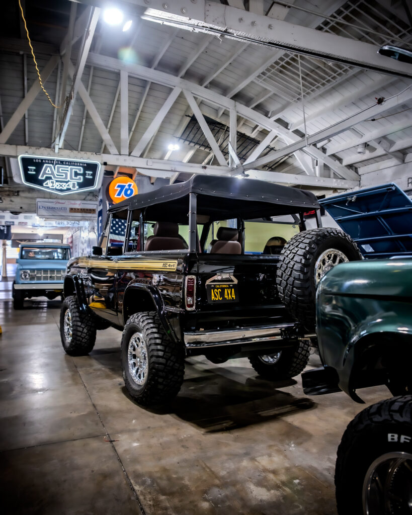 The exterior of this Classic Ford Bronco makes a statement before you ever turn the key. Bold black gloss paint provides a striking canvas for the Wild Horses 4×4 Buckaroo hood, which gives the front end an aggressive, muscular profile that hints at the power underneath. A DC Broncos soft top frame supports a custom in-house soft top crafted from premium convertible canvas with a luxurious Alcantara headliner, delivering open-air capability with a refined fit and finish. Up front, a Proto Fab front non-winch bumper keeps the lines clean and purposeful, while out back a James Duff rear spare tire carrier integrates seamlessly with the original rear bumper for a factory-correct look with added functionality. JW Speaker LED retro-style headlights and matching JW Speaker fog lights deliver modern visibility wrapped in a vintage aesthetic. The Bronco sits on a James Duff 3.5″ Monster kit with long extended radius arms and heim joints — a serious suspension setup that provides exceptional articulation and control — complemented by a 1″ body lift for Coyote swap clearance. Forged 17″ beadlock wheels wrapped in BFGoodrich 33×12.50R17 Mud Terrain tires complete the stance with a combination of strength, grip, and unmistakable presence.